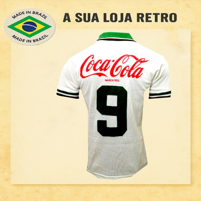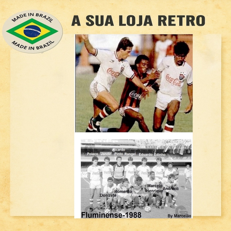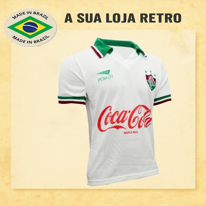 Camisa retrô do Fluminense, década de 90, com patrocínio clássico da Coca-Cola e gola polo tricolor. Escudo bordado Penalty e tecido de alta qualidade. Ícone da era de craques e Maracanã lotado. Visual fiel à época e acabamento premium. Confecção em 16 dias úteis. Entrega conforme o prazo dos Correios. Camisa ja vem com numero