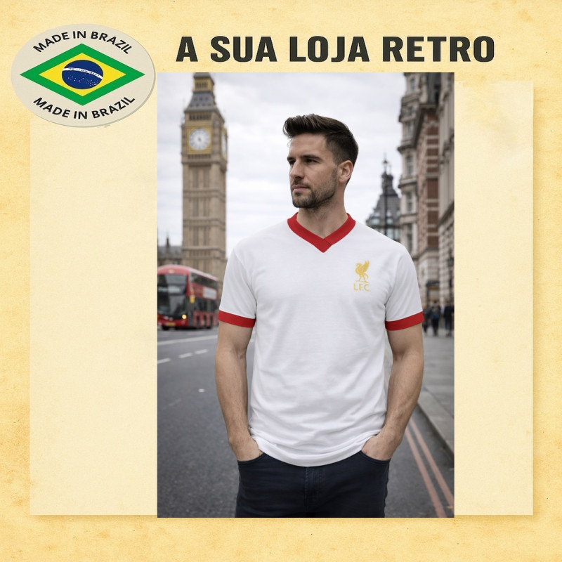 Camisa retrô do Liverpool 1978, clássico da década de 80. Modelo histórico do clube fundado em 1892, com gola V, escudo bordado, manga curta e tecido em algodão com viscose. Qualidade Futebol Retrô. Confecção em 16 dias úteis. Entrega via Correios.