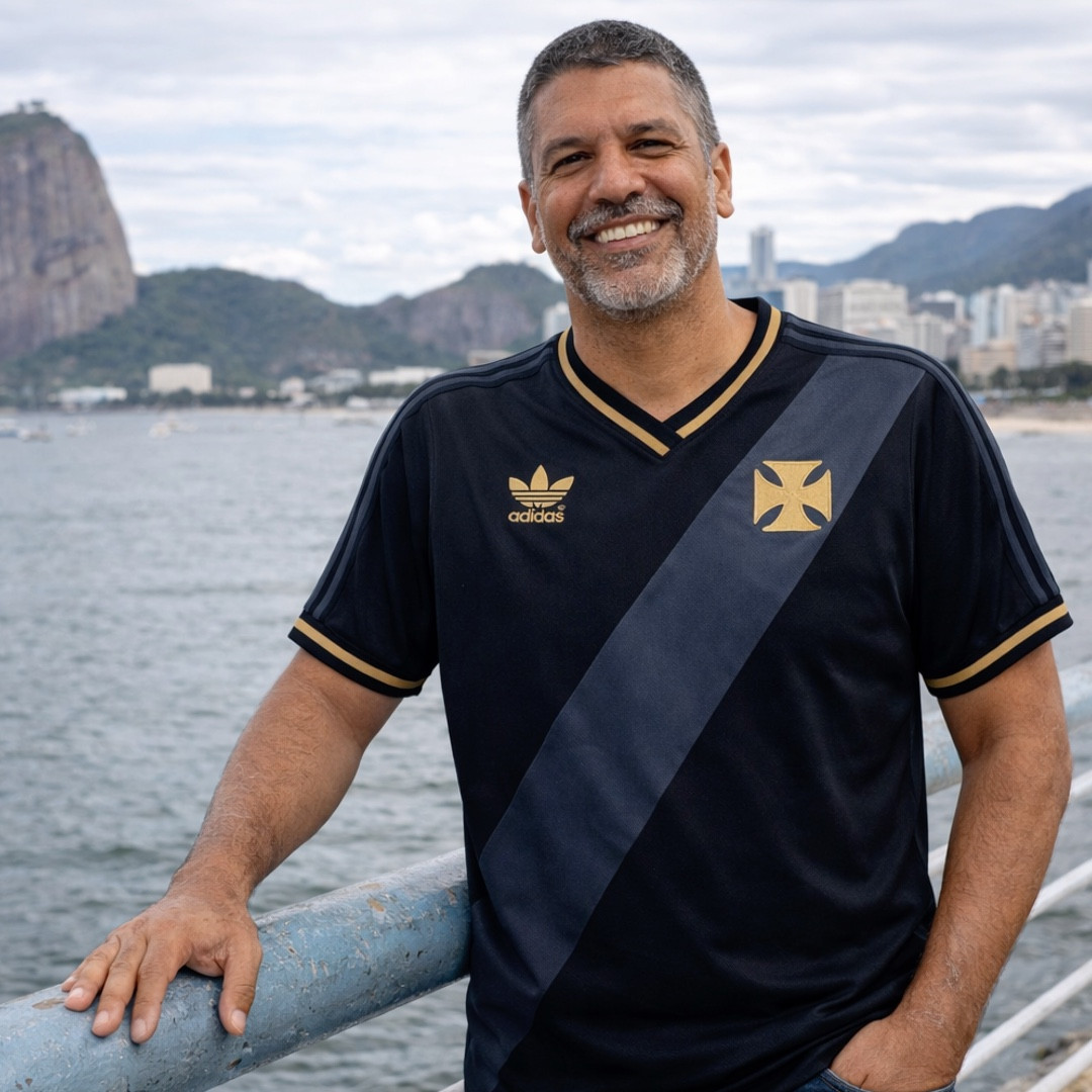 Camisa retrô do Vasco 1987, inspirada no craque Roberto Dinamite. Gola V, escudo bordado e três listras cinza. Tecido premium e padrão Futebol Retrô. Confecção: 16 dias úteis.