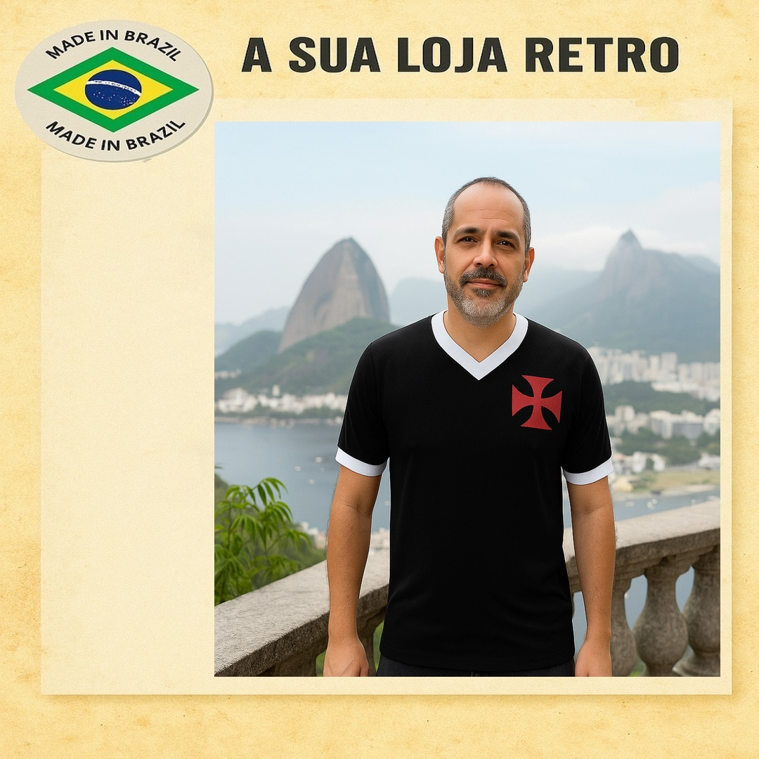História do Campeonato Carioca – Camisa antiga do Vasco, 1930, com jogos no estádio São Januário. Clube fundado em 21/08/1898, com o craque Roberto Dinamite como ídolo. Detalhes: tecido de alta qualidade, escudo bordado, gola V, padrão futebol retrô. Confecção em 16 dias úteis e entrega conforme prazo dos Correios.