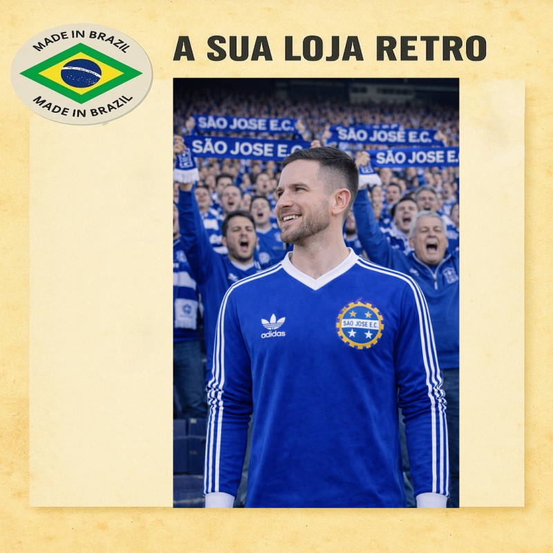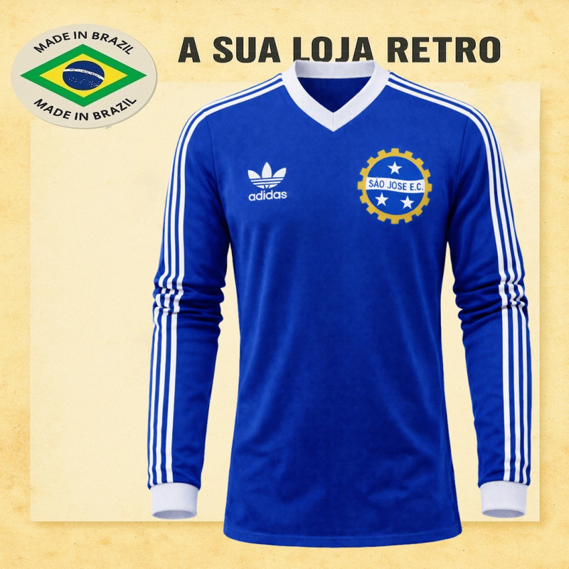 Camisa retrô da década de 80 do São José Esporte Clube, fundado em 1933, com sede no Estádio Martins Pereira. Modelo clássico da marca Adidas com gola V, escudo e logomarca bordados, manga longa e tecido de alta qualidade. Padrão da Futebol Retrô. Confecção em 16 dias úteis + entrega pelos Correios.